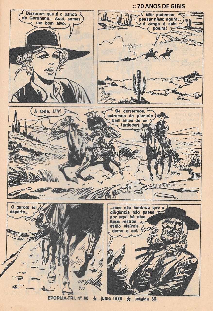 EPOPÉIA TRI - nº 60 - 2a. Edição - Julho/1986 - Folheando esta edição de Epopéia Tri confesso uma saudade enorme dessa época, quando ainda tínhamos HQs de grande qualidade, com histórias do Velho Oeste, elaboradas com cuidado, e com desenhos de traços muito bem lineados. Felizmente ainda temos TEX, hoje em dia, porque praticamente todos os outros desapareceram. Aqui, uma velha publicação da Ebal que, na verdade, originalmente vem da década de 1950 - Epopéia (inicialmente em tamanho gigante) e que teve reduzido seu tamanho ao longo do tempo, transformando-se em um gibi de fácil manuseio por suas dimensões.