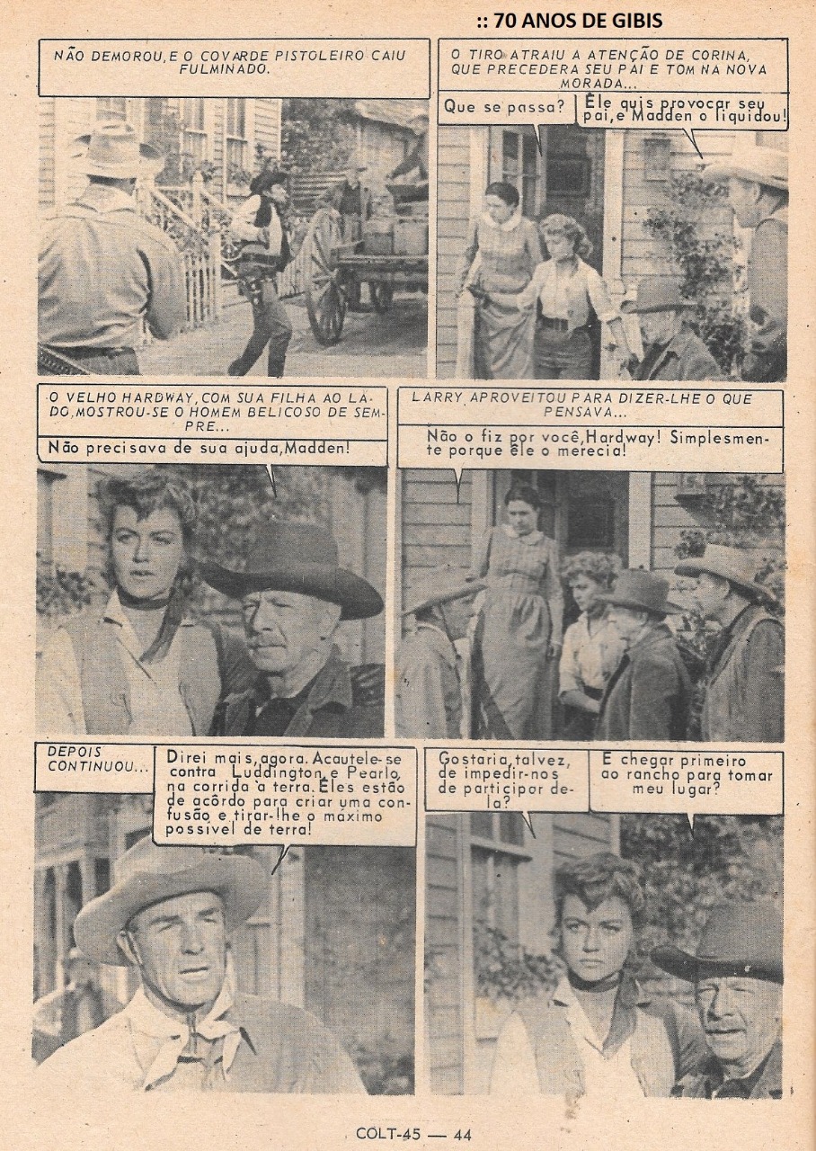 Trata-se do filme "Tall Man Riding - Nas Garras do Homem Alto", de 1955 (portanto, com 70 anos), dirigido por Lesley Selander, com Scott acompanhado de Dorothy Malone, Peggie Castle, John Denner, Paul Richards, e outros. Confesso nunca haver visto esse título deste faroeste, mesmo estar assim registrado pelo IMDb. O gibi o publicou com o título de "Furiosa Cavalgada", mais identificado com o título francês ou italiano, origens editoriais destes gibis, ainda da série Star Ciné. Mas, enfim, o título brasileiro ao ser avaliado está mais com o sentido no título original americano, melhor, então, não entrarmos em discussão !!!