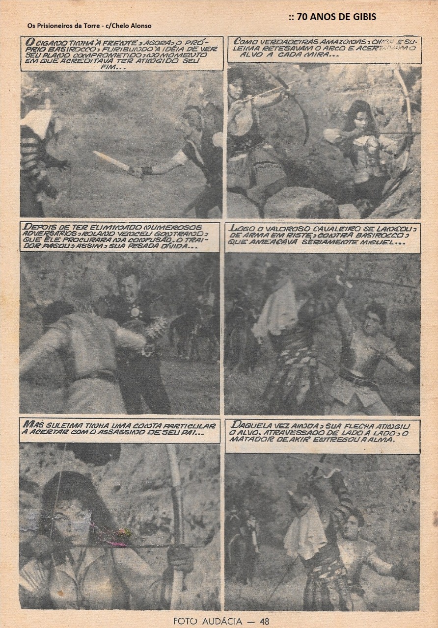FOTO AUDÁCIA - Ediex - nº 02 - 1964 - Um filme interessante, de origem italiana - Os Prisioneiros da Torre - publicado no gibi Foto Audácia, da Ediex, em fotos preto-e-branco. O elenco principal é com Chelo Alonso, Rick Battaglia e Gerard Landry. Trata-se de um dos inúmeros produtos do cinema italiano, nas décadas de 1950 e 60, conhecidos do gênero "sandália-espada", dirigido por Mario Costa, com destaque à atriz Chelo Alonso, sempre em segundo plano em outros filmes, enquanto neste, ela adota uma posição de liderança no elenco, aliás, a capa do gibi mostra uma guerreira altiva e poderosa !!!