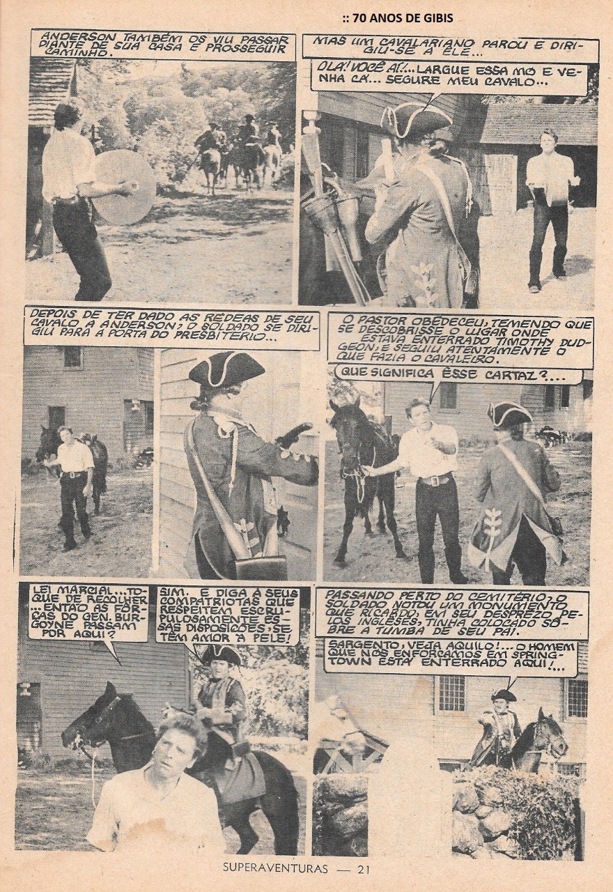 SUPERAVENTURAS - Ediex - Julho - 1963 - mais um filme de aventuras, um misto entre western e aventura histórica, ambientado no momento da independência americana, publicado pela Ediex (Editormex), em fotos preto-e-branco, cuja história se baseia no conflito entre os habitantes da então colônia e a Inglaterra, que os consideravam inimigos a serem combatidos e derrotados. O filme é baseado fielmente na peça de George Bernard Shaw, que obteve grande sucesso com ela.